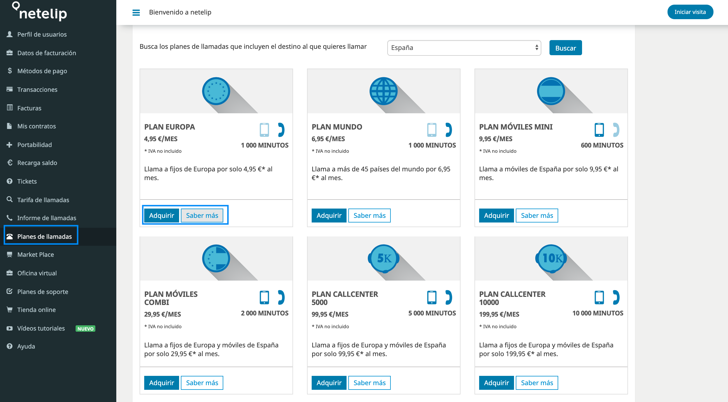 Desde la sección “Planes de llamadas“, podemos adquirir 1 o varios planes de llamadas y visualizar los que tenemos contratados: