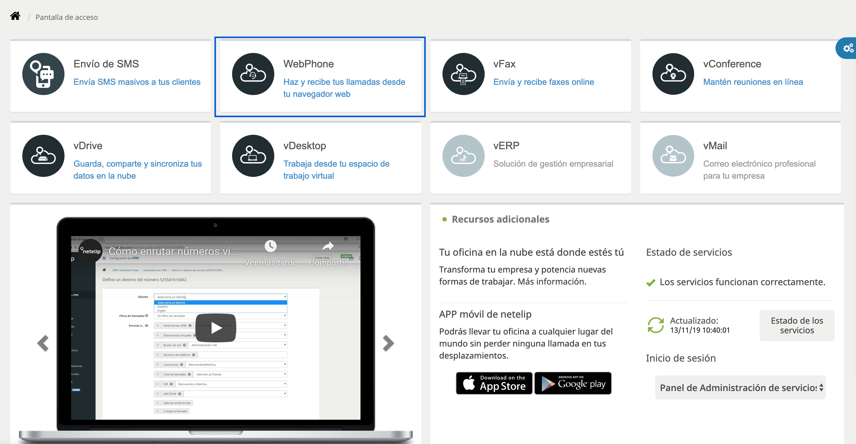 - Haz clic en el servicio “WebPhone“. Más información para configurar el servicio.